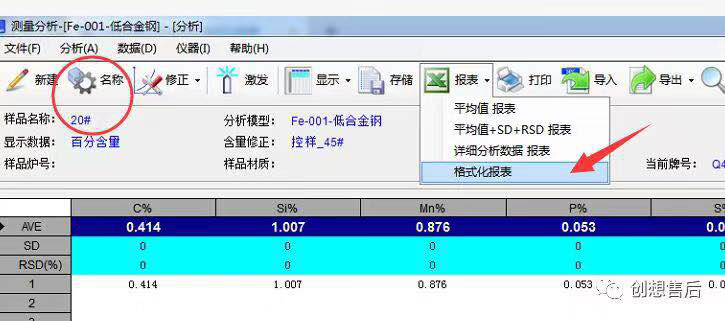 接下来,我们可以分析数据,完成一组数据分析后,设置样品名称,点击报表—格式化报表