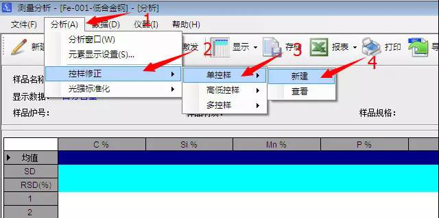 在软件打开的界面中单击“分析”—“控样修正”—“单控样”—“新建”